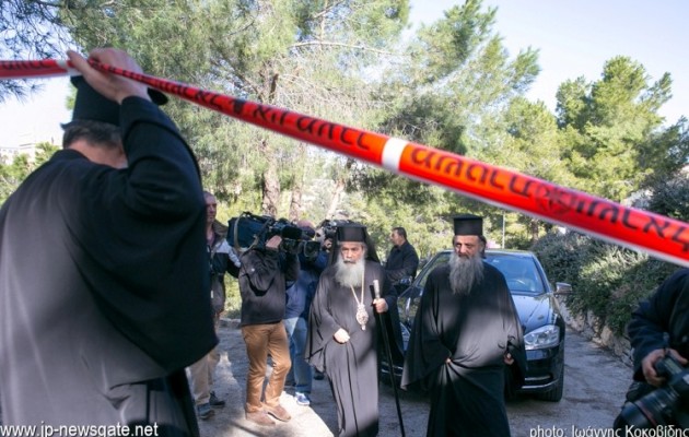 Τήν πρωΐαν μετά τήν ἀκολουθίαν εἰς τόν Ἱερόν Μοναστηριακόν Ναόν τῶν Ἁγίων Κωνσταντίνου καί Ἑλένης μετέβη ἐπί τόπου ἡ Α.Θ.Μ. ὁ Πατήρ ἡμῶν καί Πατριάρχης Ἱεροσολύμων κ.κ. Θεόφιλος, συνοδευόμενος ὑπό τοῦ Γέροντος Ἀρχιγραμματέως Ἀρχιεπισκόπου Κωνσταντίνης κ. Ἀριστάρχου καί τοῦ Γραμματέως τῆς Ἁγίας καί Ἱερᾶς Συνόδου Σεβασμιωτάτου Ἀρχιεπισκόπου Λύδδης κ. Δημητρίου καί ἄλλων Ἁγιοταφιτῶν Πατέρων καί μετά τοῦ Γενικοῦ Προξένου τῆς Ἑλλάδος εἰς τά Ἱεροσόλυμα κ. Γεωργίου Ζαχαριουδάκη δι’ ἔλεγχον τοῦ γεγονότος. Ἐνταῦθα κατά τήν ἐπίσκεψιν ταύτην εὑρίσκετο καί ἡ Ἰσραηλινή Ἀστυνομία, ἡ ὁποία εἶχε περικλείσει καί περιορίσει τόν χῶρον διά τήν ἔρευναν αὐτῆς. Ὡσαύτως ηὑρίσκετο ἐκεῖ καί ὁ ἐκπρόσωπος τοῦ Ὑπουργείου Δημοσίας Ἀσφαλείας τοῦ Ἰσραήλ κ. Μαρδοχαῖος Ζακέν.