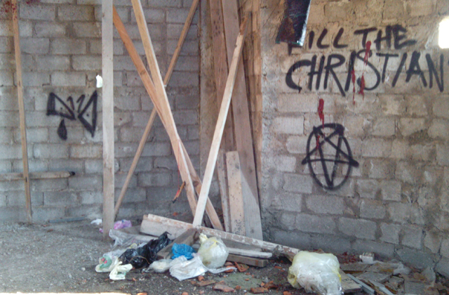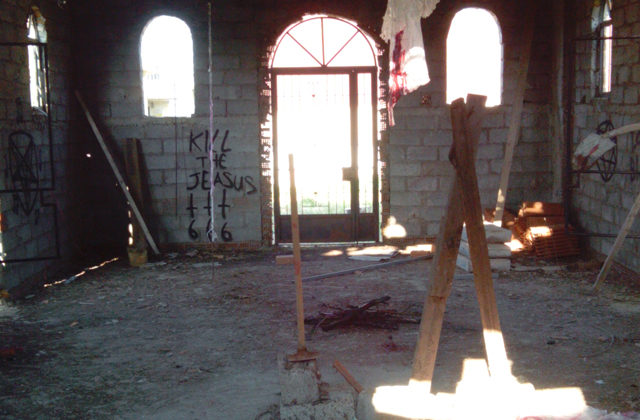 Όπως διαβάζουμε στο τοπικό σάιτ αλλά και βλέπουμε στις φωτογραφίες, συνθήματα και σατανιστικά σύμβολα έχουν γραφτεί με μπογιά στους τοίχους, ίχνη από φωτιές και καμένα κεριά και ένα «ματωμένο» νάιλον με κόκκινη μπογιά κρέμεται από το ταβάνι.