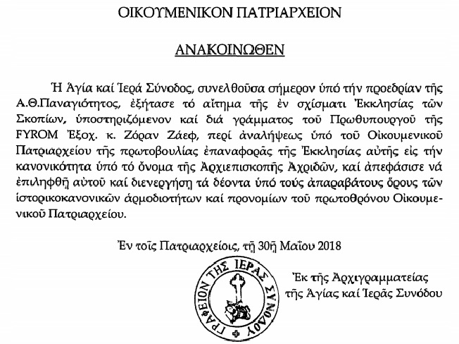 Δείτε τι αναφέρει σε σχετική του ανακοίνωση το Οικ. Πατριαρχείο, το οποίο εξέτασε την Τετάρτη 30 Μαΐου το σκοπιανό αίτημα: