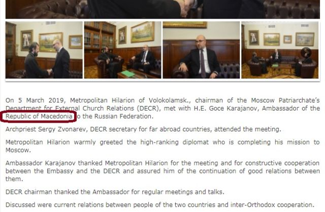 Για τη Ρωσική Εκκλησία – Πατριαρχείο Μόσχας η χώρα βόρεια της Μακεδονίας παραμένει «Μακεδονία», αν και η ίδια άλλαξε το συνταγματικό όνομά της σε Βόρεια Μακεδονία.