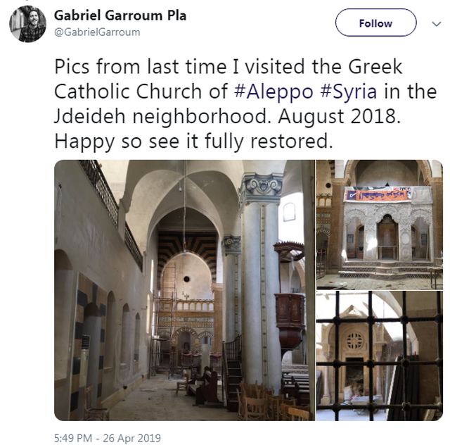 Η εκκλησία όπως έχει ανακαινιστεί μετά τις μάχες. Στις κάτω εικόνες, οι ζημιές που είχε υποστεί κατά τη διάρκεια της μάχης του Χαλεπιού.