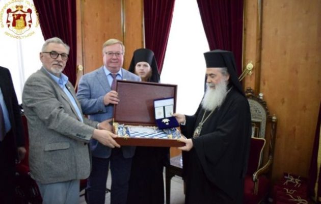Οι θρασύτατοι ρωσοπράκτορες της «Αυτοκρατορικής Ρωσικής Παλαιστινιακής Εταιρείας», μιας οργάνωσης που επιχειρεί να αφελληνίσει το Πατριαρχείο Ιεροσολύμων -όπως συνέβη στα τέλη του 19ου αιώνα και με το Πατριαρχείο Αντιόχειας– για να το παραδώσει στους «Άραβες» και να το θέσει έτσι υπό ρωσικό έλεγχο -όπως συνέβη και με το Πατριαρχείο Αντιόχειας- πραγματοποίησαν επίσκεψη στον Πατριάρχη Ιεροσολύμων.