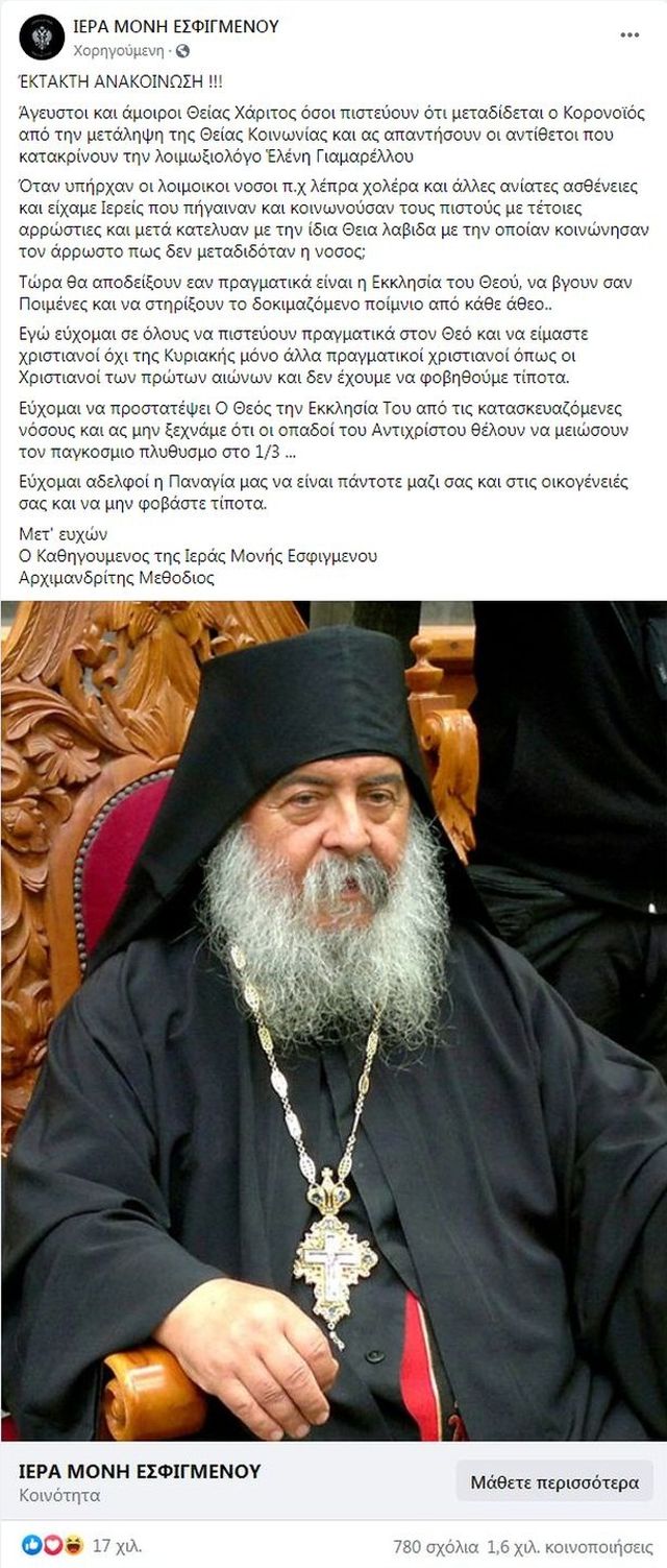 Οι σχισματικοί και καταδικασμένοι που κατέχουν παράνομα τη Μονή Εσφιγμένου, με χορηγούμενη (δηλαδή πληρωμένη διαφήμιση) ανάρτησή στο Facebook που υπογράφει ο επικεφαλής τους Μεθόδιος, υποστηρίζουν ότι ο κοροναϊός δεν μεταδίδεται με τη μετάληψη, διακηρύττουν ότι οι χριστιανοί δεν έχουν να φοβηθούν τίποτα, αναφέρονται σε «κατασκευασμένη νόσο» και για σχέδιο του Αντιχρίστου να μειώσει τον παγκόσμιο πληθυσμό.