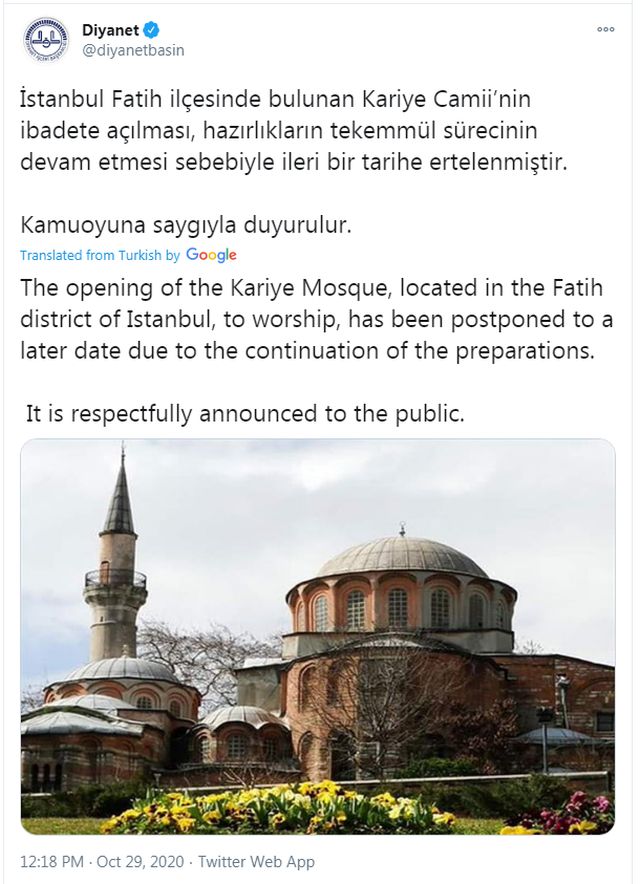 Η Διεύθυνση Θρησκευτικών Υποθέσεων της Τουρκίας (Ίδρυμα Ντιγιανέτ) ανακοίνωσε την αναβολή της μουσουλμανικής προσευχής Μονής της Χώρας την Παρασκευή 30 Οκτωβρίου, επικαλούμενο ως αιτία της αναβολής ότι δεν έχουν ολοκληρωθεί ακόμη οι εργασίες μετατροπής της Μονής σε τζαμί.