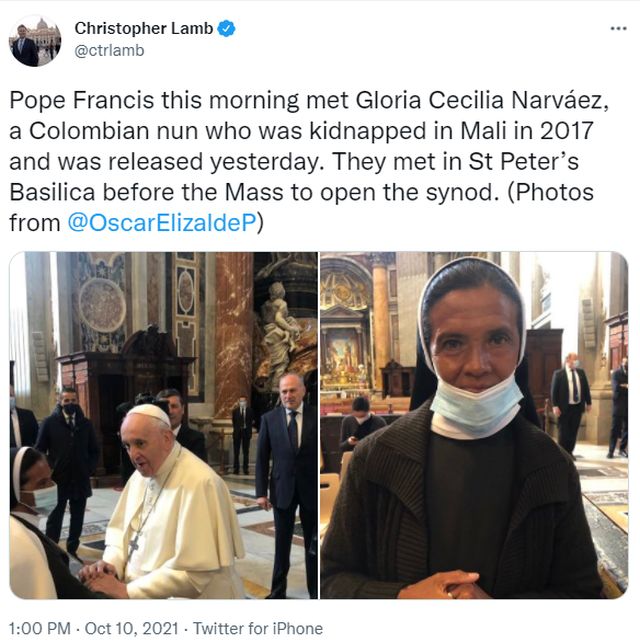 «Σήμερα το πρωί πριν από την τέλεση της Θείας Λειτουργίας (…) ο Πάπας συνάντησε την Κολομβιανή αδελφή Γκλόρια Σεσίλια Ναρβάες, η οποία είχε απαχθεί το 2017 και πρόσφατα αφέθηκε ελεύθερη», αναφέρει σε σύντομη ανακοίνωσή του ο Ματέο Μπρούνι.