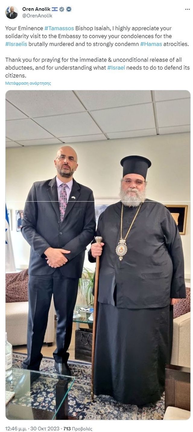 «Σεβασμιώτατε Μητροπολίτη Ταμασού Ησαΐα, εκτιμώ ιδιαίτερα την επίσκεψη αλληλεγγύης σας στην Πρεσβεία για να μεταφέρω τα συλλυπητήριά σας για τους Ισραηλινούς βάναυσα δολοφονηθέντες και τη σθεναρή καταδίκη των φρικαλεοτήτων της Χαμάς.
