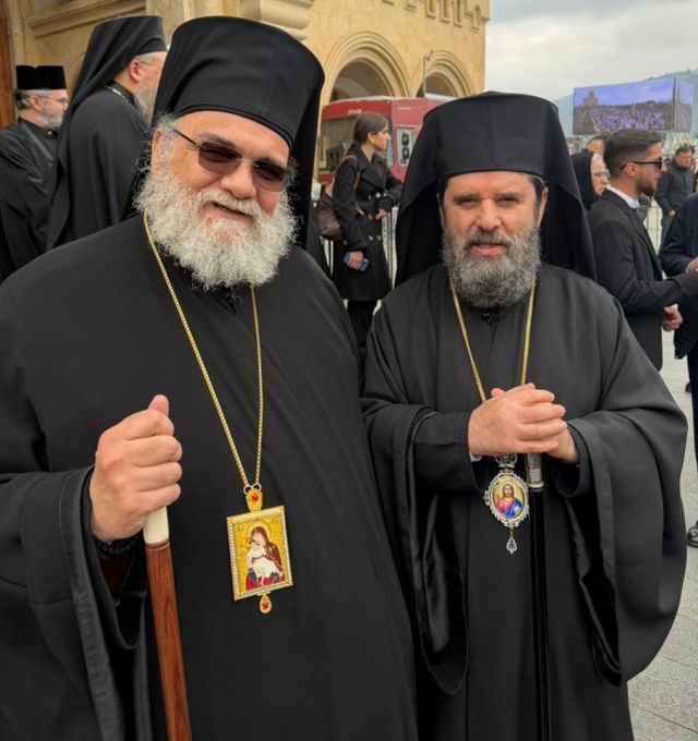 Ο εκπρόσωπος της Αρχιεπισκοπής Κύπρου, Μητροπολίτης Ταμασού Ησαΐας, με τον αρχιεπίσκοπο Αλβανίας, Ιωάννη.