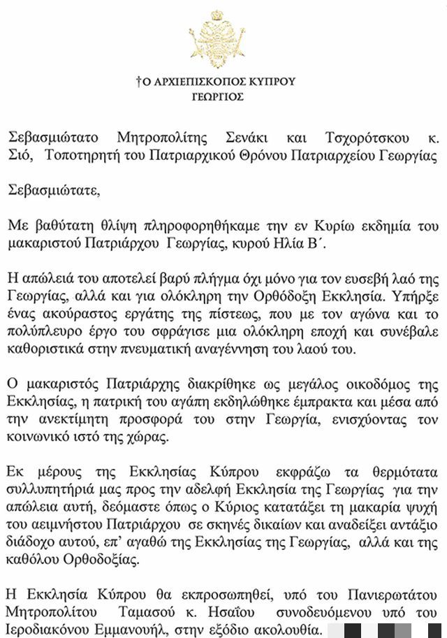 Ο Οικουμενικός Πατριάρχης προέτρεψε τον λαό της Γεωργίας να μην τους καταβάλει το πένθος καθώς η παρουσία του Πατριάρχη Ηλία στη χώρα των Ζώντων θα είναι ισχυρότερη.