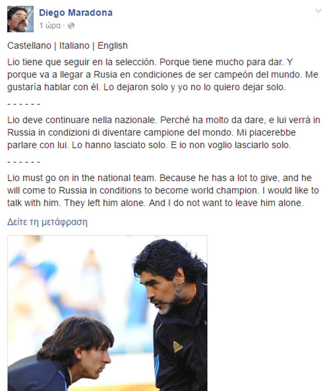 Ο Ντιέγκο στηρίζει τον Μέσι στη δύσκολη αυτή στιγμή μετά την απόφαση του να εγκαταλείψει την εθνική, αν και δεν στηρίζει αυτή την απόφαση.