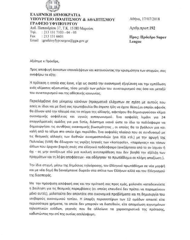Ο υφυπουργός Αθλητισμού, Γιώργος Βασιλειάδης, με επιστολή που απέστειλε στη διοργανώτρια αρχή του πρωταθλήματος κάλεσε το συνεταιρισμό να αποδεχθεί την πρότασή του για μείωση των ομάδων της Σούπερ Λίγκα σε 12. Ο κ. Βασιλειάδης κατέστησε σαφές ότι η πρόταση που έχει ρίξει στο τραπέζι η πολιτεία δεν ισχύει για κανένα άλλο μοντέλο.