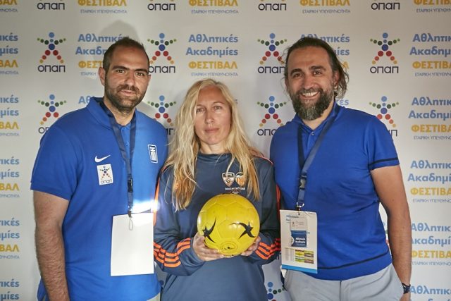 Ο Παναγιώτης Στεφανίδης, ομοσπονδιακός προπονητής ποδοσφαίρου τυφλών, Έφη Δελή, διευθύντρια Ακαδημίας Super Goal, και Σάκης Κωστάρης, συντονιστής της Ελληνικής Παραολυμπιακής Επιτροπής