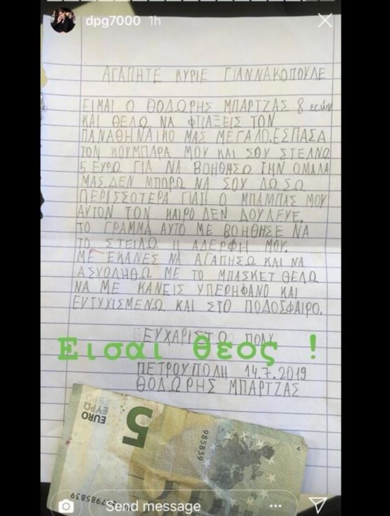 Μια συγκινητική επιστολή από έναν 8χρονο φίλο του Παναθηναϊκού και ένα ποσό της τάξης των 5 ευρώ έλαβε πριν από μερικές μέρες ο Δημήτρης Γιαννακόπουλος.