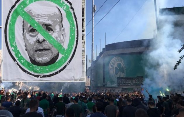 Οι φίλαθλοι των «πρασίνων», που συγκεντρώθηκαν έξω από το «Απόστολος Νικολαΐδης» γύρω στις 2 το μεσημέρι της Κυριακής (22/09), με συνθήματα και πανό ζητούσαν την άμεση αποχώρηση του μεγαλομετόχου της εταιρείας.