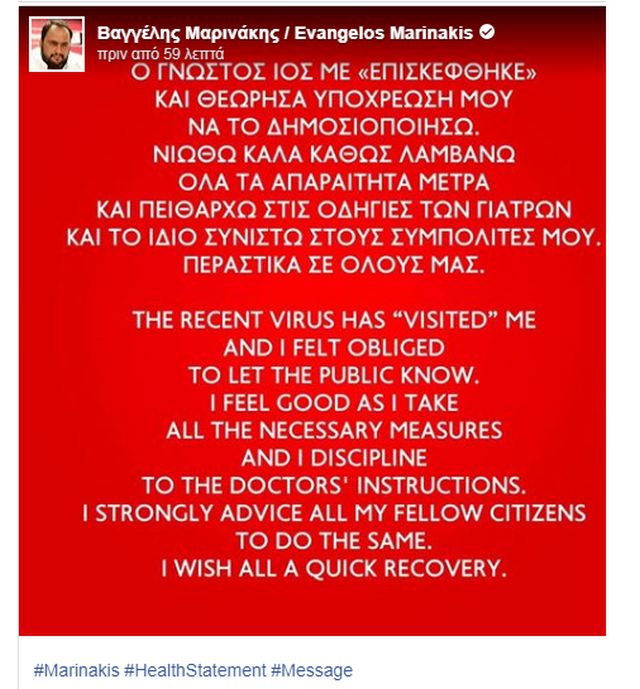 «Ο γνωστός ιός με “επισκέφθηκε” και θεώρησα υποχρέωσή μου να το δημοσιοποιήσω.