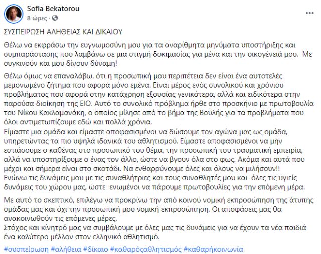 »Ενώνω τις δυνάμεις μου με τις συναθλήτριες και τους συναθλητές μου και όλες τις υγιείς δυνάμεις του χώρου μας, ώστε ενωμένοι να πάρουμε πρωτοβουλίες για την επόμενη μέρα.
