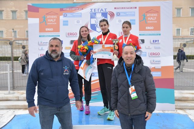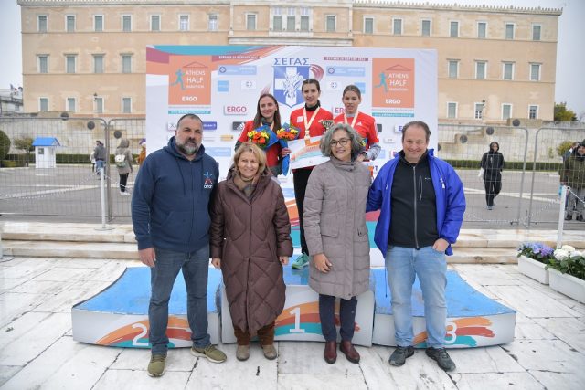 5: Ο Θανάσης Μπασδέκης, υπεύθυνος χορηγιών του ΟΠΑΠ, η Ξένια Αργιτάκη, αναπληρωματικό μέλος του ΣΕΓΑΣ στην ΕΟΕ, Σοφία Σακοράφα, πρόεδρος ΣΕΓΑΣ, ο Χρήστος Ραχιώτης, πρόεδρος της Ελληνικής Εταιρείας Αθλητικής Οδοντιατρικής βραβεύουν την μεγάλη νικήτρια του αγώνα δρόμου 5χλμ ΟΠΑΠ, Μαρία Κάσσου, τη δεύτερη νικήτρια, Ντενίσα Μπάλλα και την τρίτη, Ανδρικοπούλου Ζωή