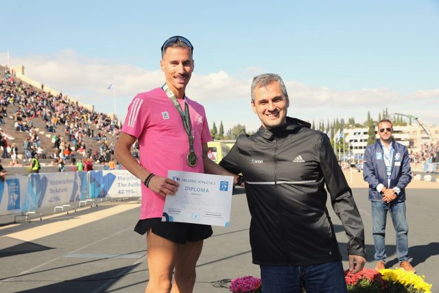 Ο Γιώργος Μενής, τρίτος στο Πανελλήνιο Πρωτάθλημα Μαραθωνίου, και ο Φώτης Ζησιμόπουλος, Chief Sales & Marketing OPAP Stores Officer του ΟΠΑΠ: