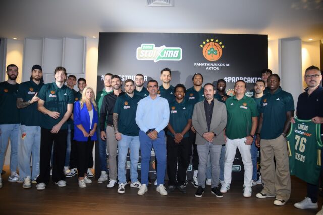 Ergin Ataman, προπονητής Παναθηναϊκού AKTOR, Γιάννης Πανόπουλος, OPAP Chief Online Officer, Οδυσσέας Χριστοφόρου, Αναπληρωτής Διευθύνων Σύμβουλος ΟΠΑΠ, Φώτης Ζησιμόπουλος, Chief Sales & Marketing OPAP Stores Officer, και Lukas Antos, OPAP Chief Customer Officer, με την ομάδα του Παναθηναϊκού AKTOR