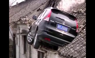 Με “προσγείωση” στη στέγη ενός σπιτιού ολοκληρώθηκε η τρελή πορεία ενός αυτοκινήτου, στην πόλη Ταϊσού της επαρχίας Τσιανγκσού, στην ανατολική…