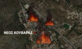 Σε πύρινο κλοιό βρίσκεται η περιοχή κάτω από το Πάνειον Όρος, στον Κουβαρά. Από εκεί, η φωτιά πέρασε στους οικισμούς…