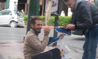 Συγκλονιστικές φωτογραφίες: Νεαρός αγοράζει παπούτσια σε ξυπόλυτο άστεγο