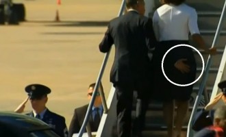 Μπροστά η Μισέλ, γιατί οι κυρίες προηγούνται, πίσω ο Μπάρακ στη σκάλα του προεδρικού αεροσκάφους. Και ξαφνικά, μπροστά στις κάμερες…