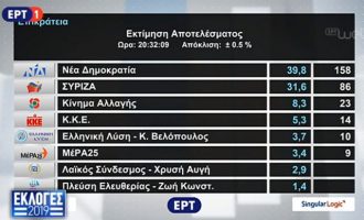 Εκτίμηση Singular Logic: ΝΔ 39,8% – ΣΥΡΙΖΑ 31,6% – Εκτός η Χρυσή Αυγή