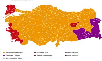 Εκλογές Τουρκία: Πρώτος με 55% είναι ο Ρετζέπ Ταγίπ Ερντογάν (κίτρινο χρώμα στον χάρτη) στο 73,7% των εκλογικών τμημάτων, στις…