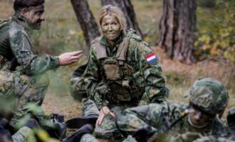 Η βασίλισσα Μάξιμα της Ολλανδίας με στολή παραλλής και φούμο στο πρόσωπο σε στρατιωτική άσκηση