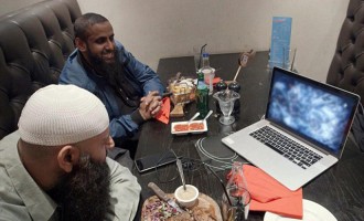 Δυο τζιχαντιστές απολαμβάνουν το γεύμα τους σε εστιατόριο του Λονδίνου βλέποντας ένα βίντεο στο φορητό τους υπολογιστή. Γελούν και δείχνουν…