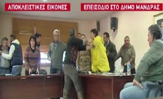 Ξύλο και μπουνιές στο Δημοτικό Συμβούλιο Μάνδρας ενώ θρηνούν νεκρούς (βίντεο)