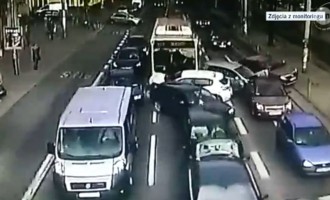 Τα αυτοκίνητα είναι σταματημένα σε φανάρι στην Πολωνία,όμως το λεωφορείο έχει πρόβλημα με τα φρένα και αρχίζει να τα παρασύρει….