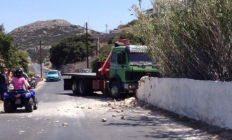 Τρελό ατύχημα στη Σύρο με νταλίκα να ξεφεύγει από την πορεία της και να καρφώνεται σε μάντρα. Αιτία του σπάνιου…