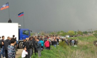 Στη φωτογραφία βλέπετε εκατοντάδες ρωσόφωνους πολίτες του Σλοβιάντσκ, της ανατολικής Ουκρανίας, να έχουν “μπλοκάρει” τη φάλαγγα των ουκρανικών αρμάτων μάχης…