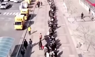 Βίντεο από ντρον δείχνει μία ουρά εκατοντάδων ανθρώπων έξω από σούπερ μάρκετ στην πόλη Νταεγκού στη Νότια Κορέα, προκειμένου να…