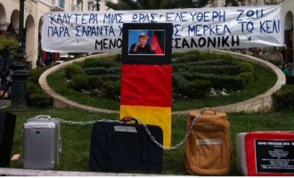 Θεσσαλονίκη: Διαμαρτυρία με βελάκια στο πορτραίτο της… Μέρκελ (βίντεο)