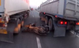 Πιο τυχερός, πραγματικά, δεν γίνεται. Ο μοτοσικλετιστής πέφτει πάνω σε άλλον μοτοσικλετιστή, που προσπαθεί να περάσει ανάμεσα σε δύο τεράστια…