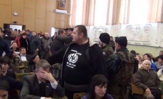 Δείτε σε βίντεο Ουκρανούς ναζί, οπλισμένους με ρόπαλα και σφυριά, να τρομοκρατούν δημοτικούς συμβούλους