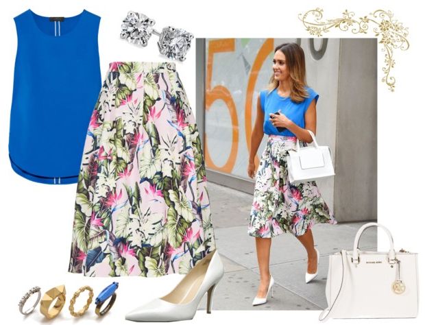 Η όμορφη ηθοποιός συνδύασε το floral pattern με ένα μπλε top, λευκές γόβες και τσάντα στο ίδιο χρώμα.