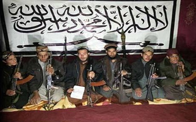 Οι ένοπλοι ποζάρουν μπροστά από μια σημαία που γράφει: «Δεν υπάρχει άλλος θεός παρά μόνο ο Αλλάχ και ο Μωάμεθ είναι ο Προφήτης του».