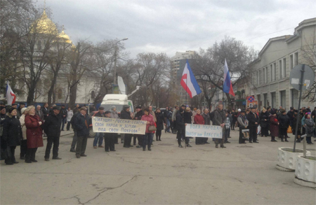 Οι συγκεντρωμένοι κρατούν αφίσες που γράφουν “Μητέρα – Ρωσία, βάλε όλο το λαό σου και τη γη σου κάτω από την κάλυψη σου”.