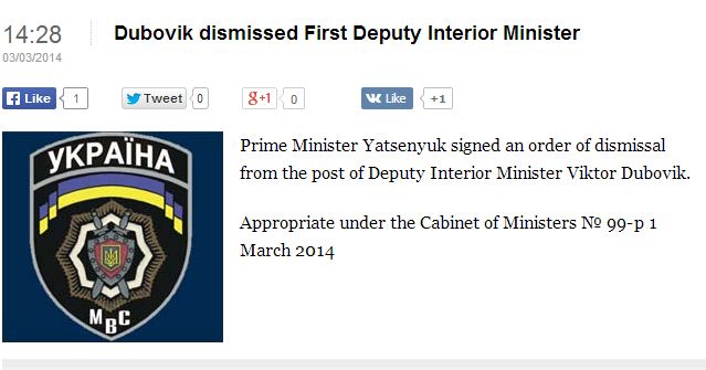“O Αρσένι Γιατσένιουκ έδιωξε τον υφυπουργό Εσωτερικών της χώρας Βίκτορ Ντουμπόβικ” γράφει λακωνικά το ουκρανικό πρακτορείο ειδήσεων Ιντερφάξ όμως είναι γνωστό ότι στον απολυθέντα υπουργό χρεώνεται η αποτυχία συνολικά στον έλεγχο της κατάστασης στις περιοχές όπου οι Ρώσοι είναι πλειοψηφία.