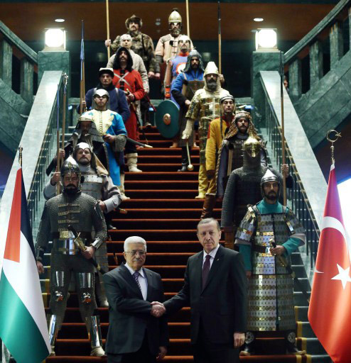 Το όλο σόου, δείγμα της μεγαλομανίας του νεο-οθωμανού ισλαμιστή Τούρκου Προέδρου, στήθηκε κατά την επίσκεψη του Παλαιστίνιου προέδρου Μαχμούντ Αμπάς στην Άγκυρα στις 12 Ιανουαρίου.