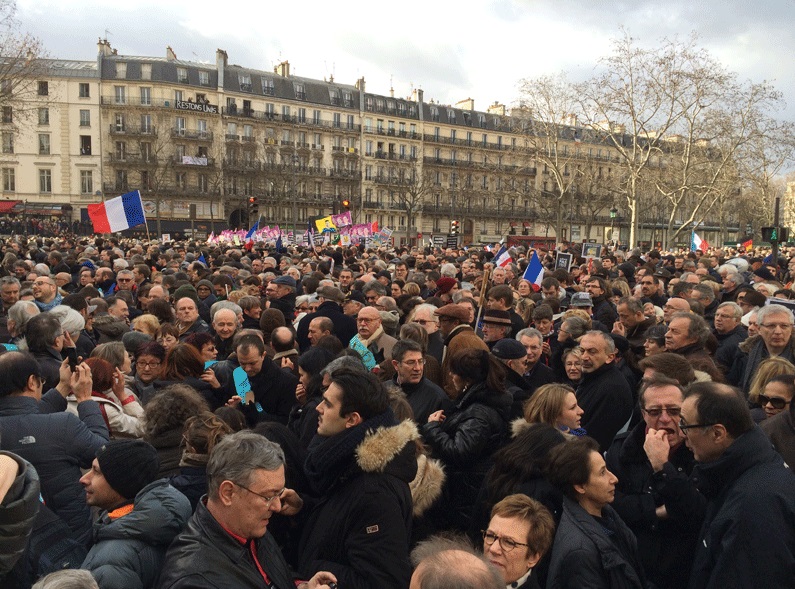 Παρίσι 11 Ιανουαρίου 2015. Τέσσερα εκατομμύρια Γάλλοι διαδηλώνουν σε όλες τις μεγάλες πόλεις της χώρας τους ενάντια στην τρομοκρατία των τζιχαντιστών.
