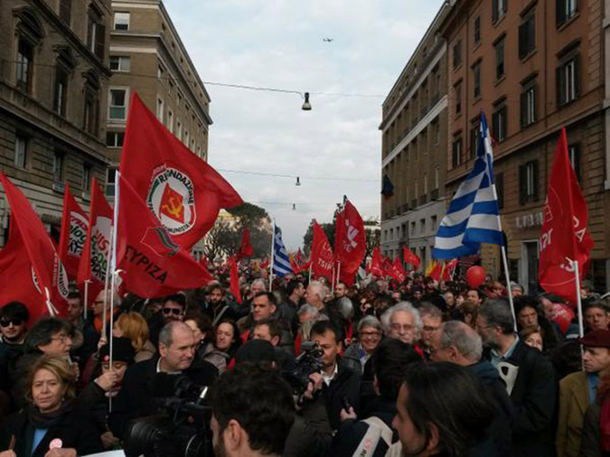 Οι δρόμοι «κοκκίνισαν» από τις σημαίες της Altra Europa con Tsipras, ενώ δεκάδες ήταν τα πανό που έγραφαν «κατά της λιτότητας».