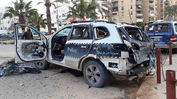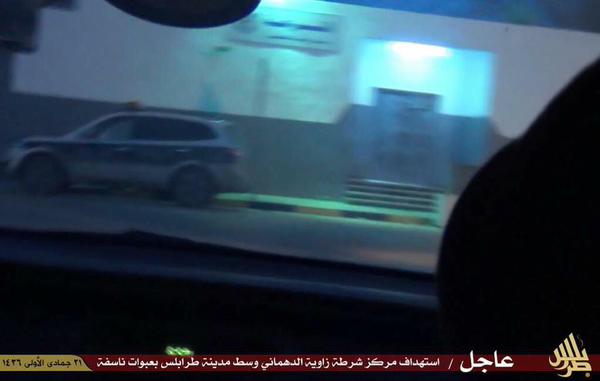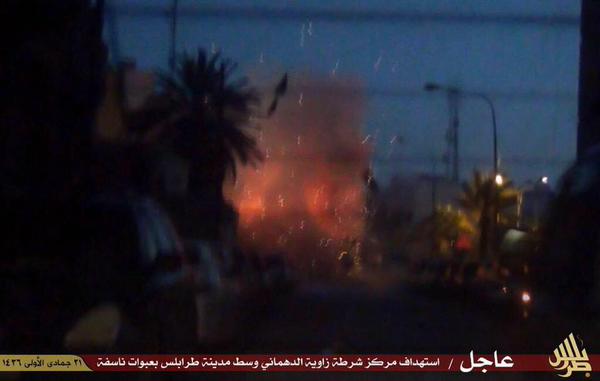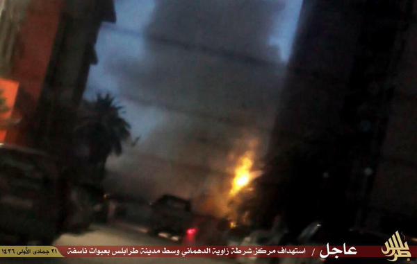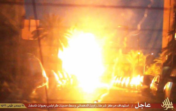 Οι τζιχαντιστές έδωσαν στη δημοσιότητα φωτογραφίες από την έκρηξη στο αστυνομικό τμήμα, το οποίο βρίσκεται κοντά στο υπουργείο Εξωτερικών, στο κέντρο της Τρίπολης.