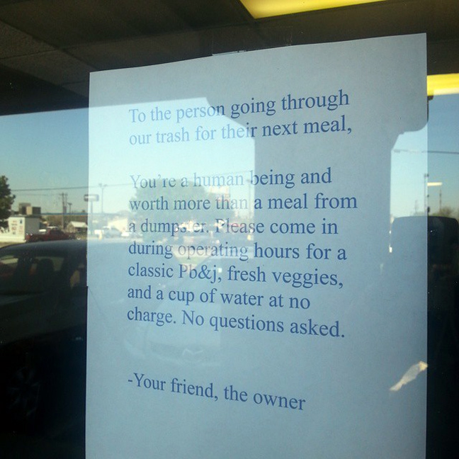 Όταν η ιδιοκτήτρια εστιατορίου Άσλεϊ Τζίρον (Ashley Jiron) παρατήρησε ότι κάποιος άστεγος συνάνθρωπος έψαχνε τα σκουπίδια και έτρωγε από αυτά, τότε κάθισε στον υπολογιστή της και έγραψε ένα σημείωμα.