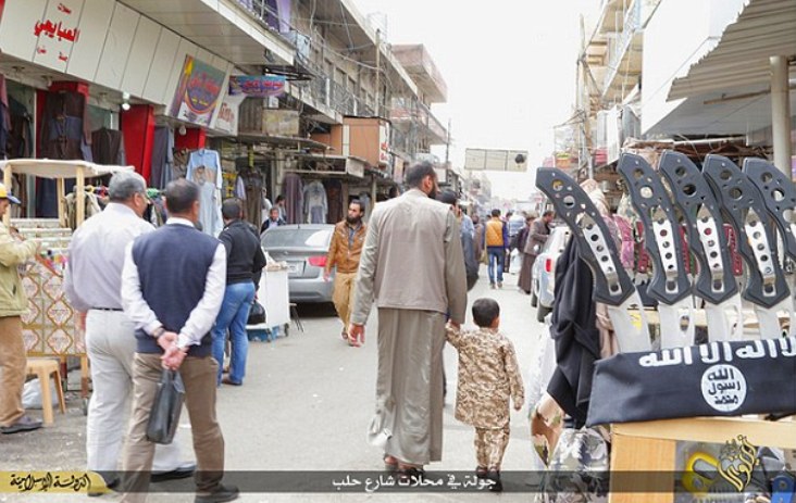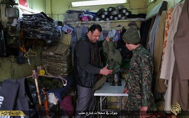 Πατέρας και γιος βγήκαν για ψώνια. Ο μπόμπιρας είναι ντυμένος κομάντο. Δεξιά στη φωτογραφία βλέπουμε στρατιωτικά μαχαίρια, περιζήτητα μεταξύ των τζιχαντιστών. Το σύμβολο του Ισλαμικού Κράτους υπενθυμίζει ότι προορίζονται για… ιερό σκοπό.Η παραγωγή των στολών μάχης είναι ντόπια. Οι παραδοσιακοί ράφτες έπαψαν να ράβουν κοστούμια και πουκάμισα και τώρα δεν προλαβαίνουν να φτιάχνουν στολές.