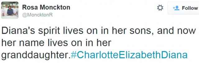 Χαρακτηριστικό είναι μάλιστα ότι ελάχιστα λεπτά μετά την ανακοίνωση του ονόματος της μικρής «πριγκίπισσας του Κέμπριτζ», η καλύτερη φίλη της Νταϊάνα, Ρόζα Μόνκτον έγραψε στο twitter. «Το πνεύμα της Νταϊάνα ζει μέσα από τους γιους της και τώρα το όνομά της ζει μέσω της εγγονής της».