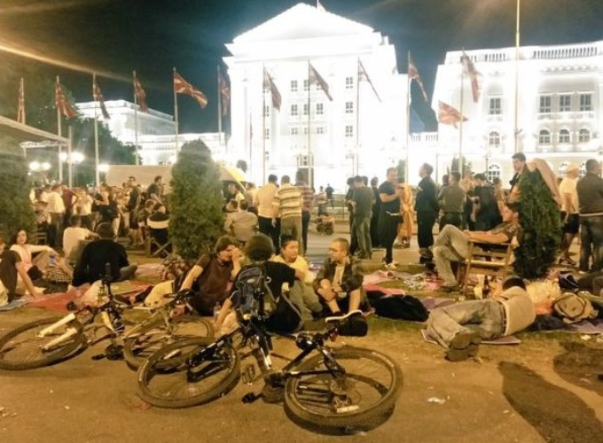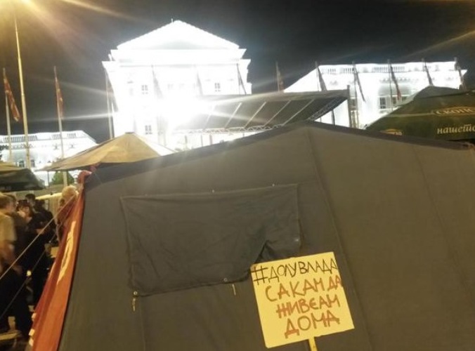 Μπροστά από το κτίριο της κυβέρνησης στα Σκόπια διανυκτέρευσαν σε σκηνές εκατοντάδες διαδηλωτές κυρίως υποστηρικτές της αντιπολίτευσης.
